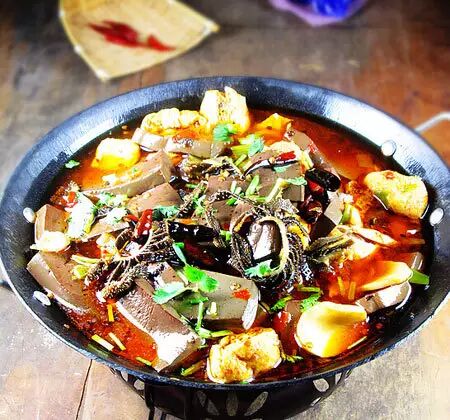 将鸭血入沸水中焯水后捞出。另起锅,注入油,爆香,麻椒和辣椒碎。