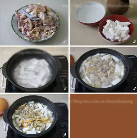 砂锅里倒入椰子水和椰肉。煮开后放入鸡块,烧开后捞去表面的浮末。