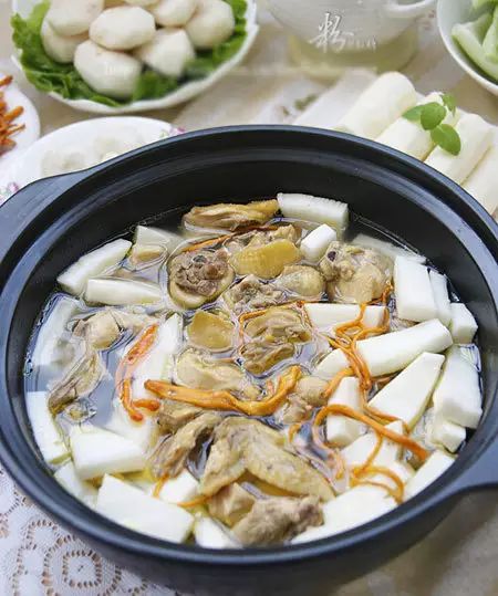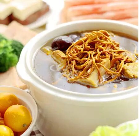 鸡块煮熟(煮开后再煮3-5分钟),放入少量新鲜虫草花装饰一下,加适量盐,即可开吃。