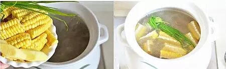 3、将玉米,姜片,葱结加入锅中一起煮开。