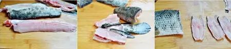 将鱼排剁开大块。将片下的鱼肉切成鱼片,垂直下刀:第一刀切下时不要切透,第二刀完全切断。