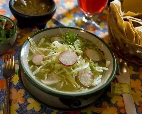 Pozole玉米肉汤是当地的传统美食,汤中有猪头肉、大玉米粒和红菜头你,通常和猪肉搭配食用。