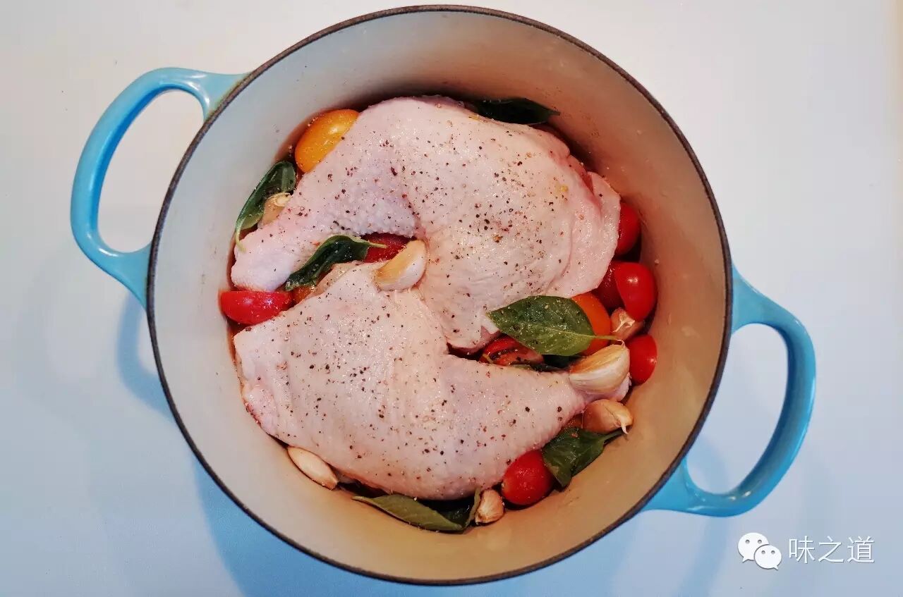 盐的用量:100克肉加1克盐,依次叠加即可。鸡腿撒好盐,均匀抹上一层橄榄油,再磨一点黑胡椒碎。蒜粒和罗勒也放入锅中,鸡腿下方和两侧都放一点,注意配料都不要遮挡鸡肉。
