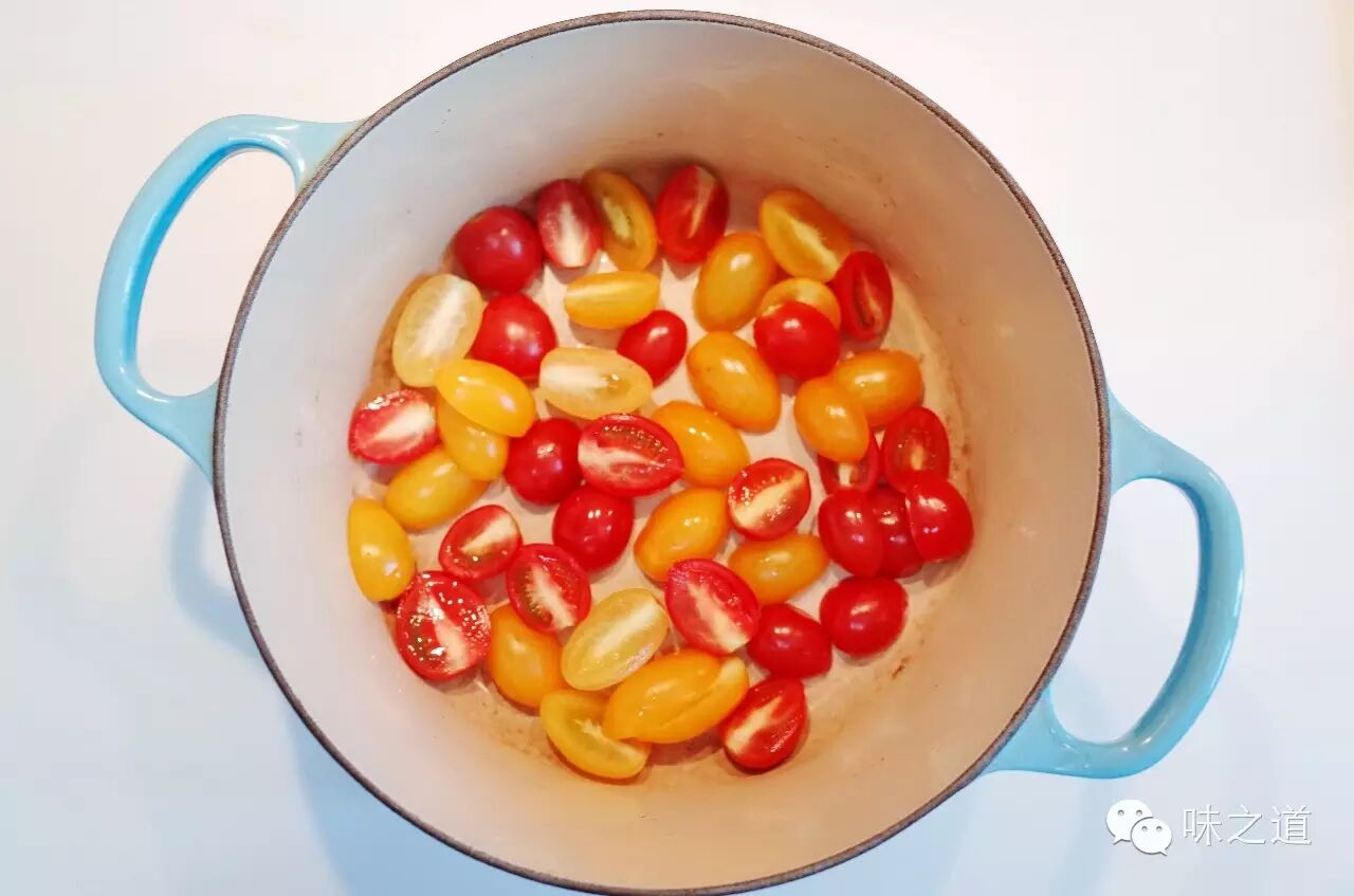 番茄对半切开,平铺在锅底。整粒大蒜只去掉最外层的薄衣,然后带皮放入锅内。大蒜不去皮的原因:更完整地保留蒜的味道,此外,大蒜烤完后会变得非常柔软,带皮烤可以保持蒜的完整性。