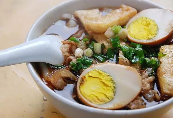 此“粿汁”非彼“果汁”,虽然读音相同,但实质相差太远了。粿汁是用米浆放在平底锅上煎熟烤干而成的,切成三角形的小块,放在沸水中煮,简单地调入精盐、糯米粉浆即成。吃时必配葱珠朥,还有其他佐料任意配搭,如炸花生仁、卤豆腐干、卤鸡蛋、卤肉和腊肠等。所以吃粿汁可以说是丰俭由人,从五毛到十几块都能吃。