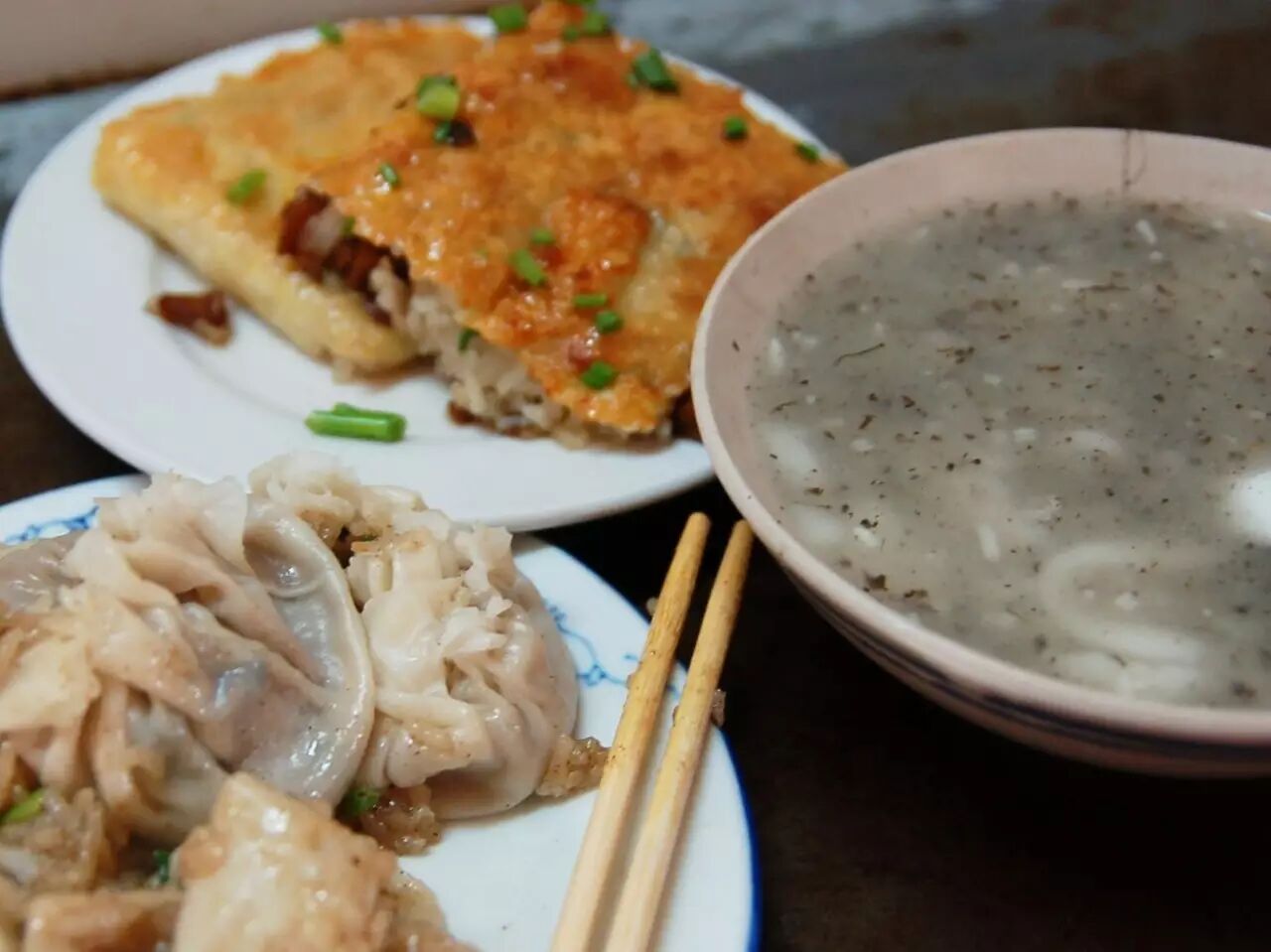 典型的武汉早饭:豆皮、烧卖、糊米酒