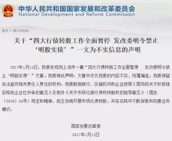 1月11日早上,一篇《四大行债转股工作全面暂停 发改委明令禁止“明股实债”》文章在网络上流传。当日下午,国家发改委网站发布声明,表示该文章涉及发改委的内容为不实信息,纯属编造。(澎湃新闻)