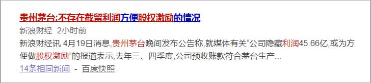 4月19日,贵州茅台晚间公告,就媒体有关“公司隐藏利润45.66亿,或为方便做股权激励”的报道表示,去年三、四季度,公司预收账款符合茅台生产工艺特质。目前尚未启动股权激励有关工作。因此,报道所称茅台截留利润是为股权激励的情况是不存在的。(新浪财经)