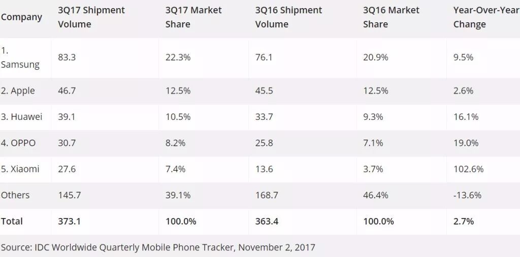 11月3日,IDC公布第三季度全球手机市场出货量报告,三季度全球智能手机出货量达到3.731亿台,同比增长2.7%。三星、苹果、华为、Oppo、小米占据前五位,它们的出货量全都增加,除了苹果其它四家企业的市场份额上升。