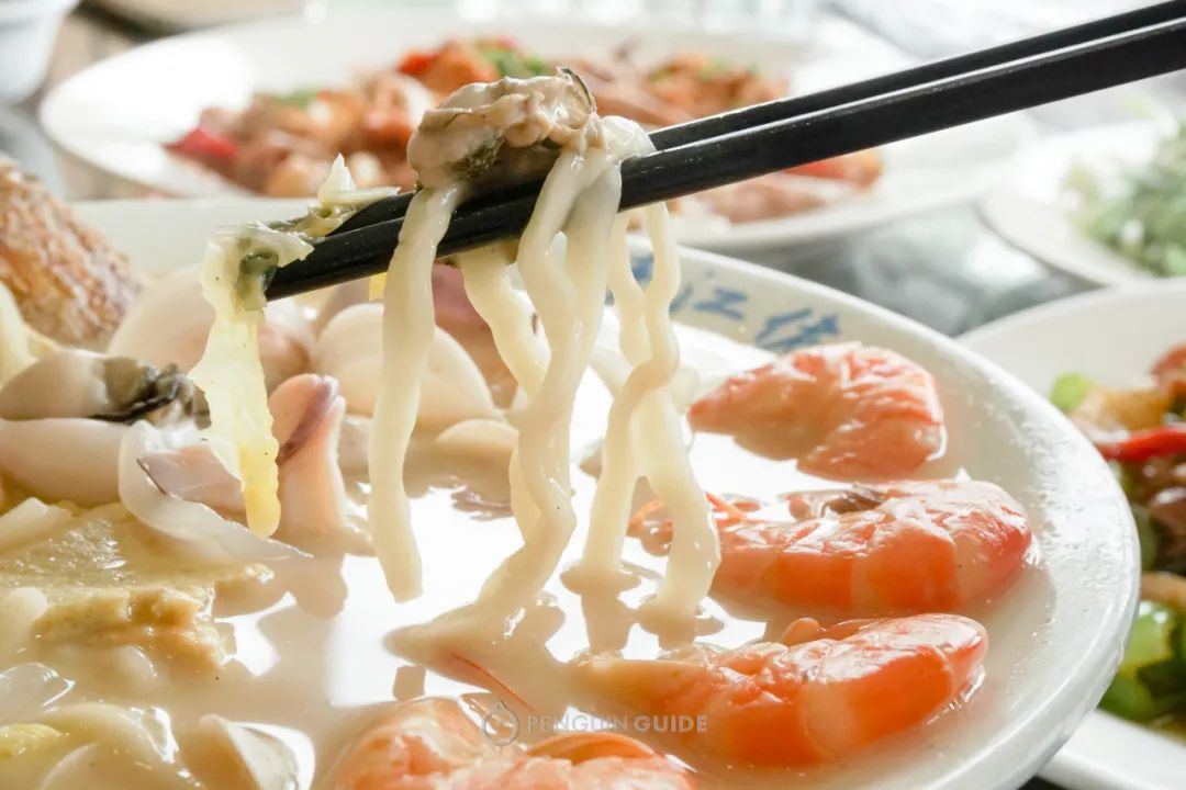 本身就是主营面条,走的就是平价实惠路线,人均七八十能点一桌菜,在上海这样的都市,真心难找....... 最后还有一枚彩蛋:是一家湖南粉店,能吃到很赞的湘菜......温州海鲜面在上海相当少见,而像这种主打20-40元的性价比小店,更是一只手数得过来。这家品类尤其丰富👇 黄鱼是其中最经典的。而且一定是整条、煎过的黄鱼,而不像本帮黄鱼面里的肉是片下来在汤里汆熟的——好处就是外皮焦香,但里肉不碎,保持弹韧。海鲜面另一大标志:标准抻劲的手擀面,嚼劲介于细面和北方手擀面之间,非常适口。最喜欢汤里标配的蛋皮,有蛋糕般的香气,跟姜末一块煎的,是淡淡的辛香。午市以吃面为主,12点不到就坐满了附近居民和上班族,炒粉干也是人气之选,镬香尤其优秀。但让我甘愿坐10站地铁再换乘公交来吃的,还是他们家的温州家常小炒。 红烧鱼籽鱼泡:这是我在任何海鲜馆子都必点的一道菜。相比湘菜里的鱼籽鱼泡锅仔,这里的鱼籽不会煮碎,完完整整还带着胶质,是胆固醇超标的快乐。
