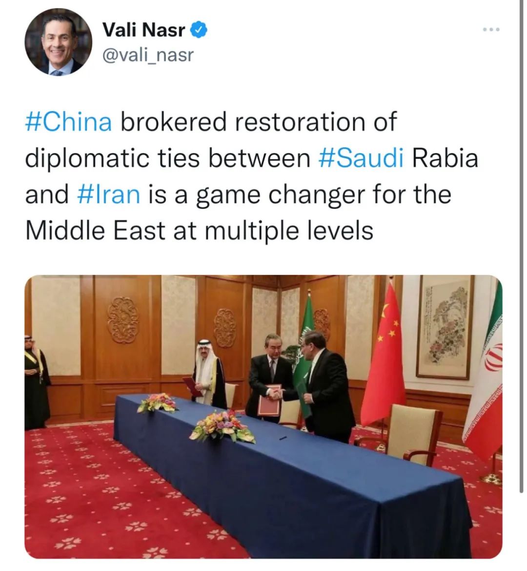 约翰霍普金斯大学教授纳斯尔写道:“中国促成伊朗和沙特回复外交关系的协议,在多个层面改变了中东的游戏规则。”