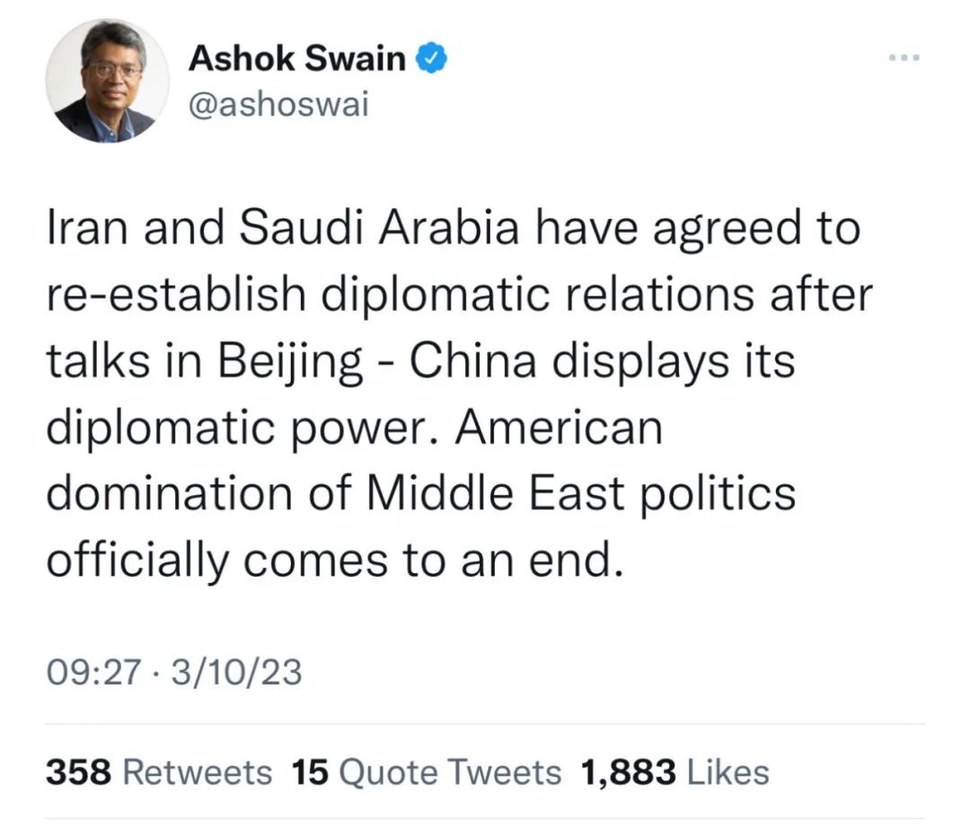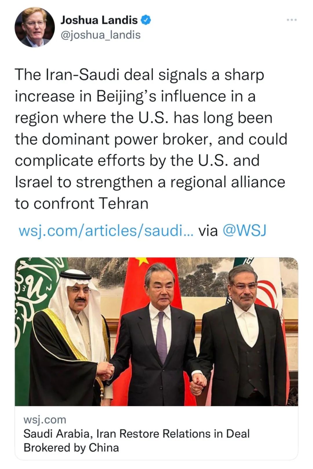 美国中东问题专家兰迪斯写道:“伊朗-沙特协议预示着中国,在美国长期主导地区的影响力急剧提升...”