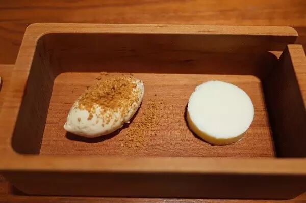 上来甜品的时候真的就被美哭了,比作姑娘的话,不是多炫目妖艳那型,而是端庄大方的知性美女。蜜制过的金桔、香草奶油、底下果酱用setoka orange做,一种高级的日本柑橘,撒上柚子花。咬了一口后继续被美哭,这次是美味的美!