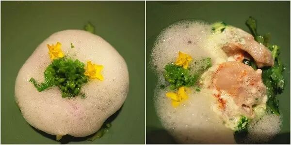 下一道果然是躲在气泡里的,一看英文菜名“clam and rape blossoms”,经过饭搭子去年的纠正,看来餐厅还是马上把写错的单词虚心改过来了嘛。拨开气泡,食材是菜花和蛤蜊,温和的sauce调味。