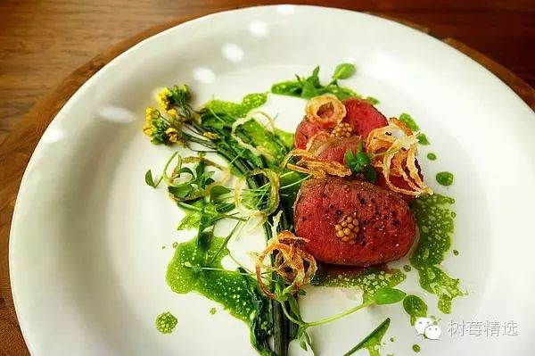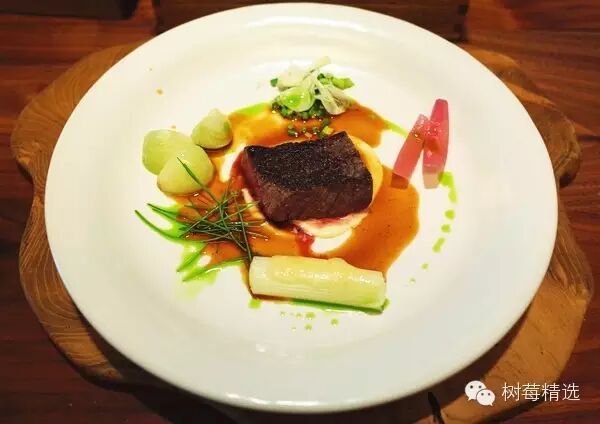 迷你红萝卜配芥末奶油,萝卜连叶子一起,这开场也太纯天然了吧。当然叶子的功能只是方便拿而已,奶油酱很好吃,大厨真是厉害,一道菜就让我感觉自己变成了森林里吃萝卜的兔子。