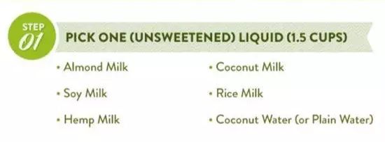 例如:杏仁奶、椰奶、豆奶/豆浆、米浆、麻牛奶(国内没有,可替换为低脂牛奶或希腊酸奶)、椰子汁(或其他不加糖的果汁)、清水(或绿茶)。