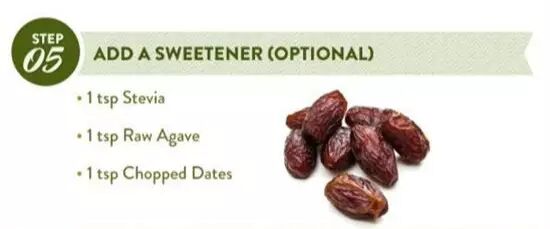 例如:1小匙甜菊糖甙(代糖)/龙舌兰花蜜(植物糖浆)/切碎的椰枣(果干果脯类)。