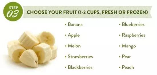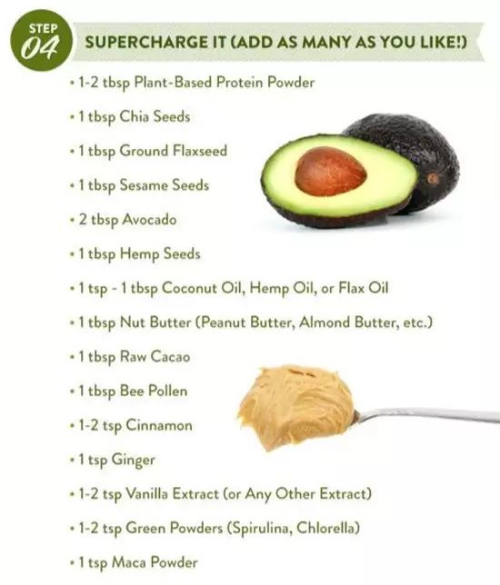 例如:2大匙牛油果、1-2大匙植物蛋白粉、1大匙花生酱/奇亚籽/亚麻籽粉/芝麻(坚果类的种子、酱或粉),还可以加入1小匙蜂花粉/可可粉/肉桂粉/香草精/螺旋藻素等增色添香。