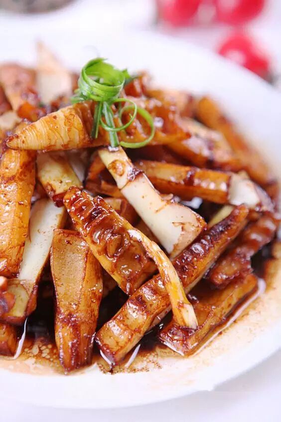 三支春笋切条,焯水沥干;起油锅,油比平时炒菜稍多,入笋大火猛炒;调入2大勺酱油和1小勺糖,别加水,炒匀后转中小火,加盖焖烧,注意需不时开盖翻炒以防糊锅;笋质塌软后,再加1大勺糖,转大火收至汤汁浓稠并出现焦糖味,即可起锅——好火候烹出的焦糖香气,是油焖菜的精髓,也是与普通的红烧最大的区别。