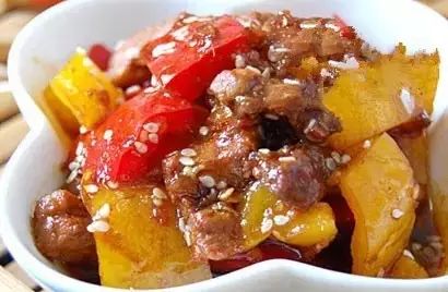 猪肉,红椒,黄椒,盐,姜,蒜,料酒,老抽,白芝麻,甜辣酱,油