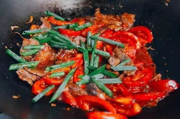 ▼然后加入牛肉,大火翻炒约20秒,转中火,将剩下的香葱和玉米粉混合物倒入,使酱汁变浓稠,煮15秒。香气四溢,赶紧装盘享用吧~