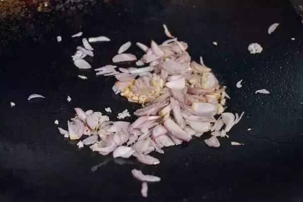 ▼中火热锅,再加一勺油,倒入姜片、蒜末、香葱炒香,约10秒。