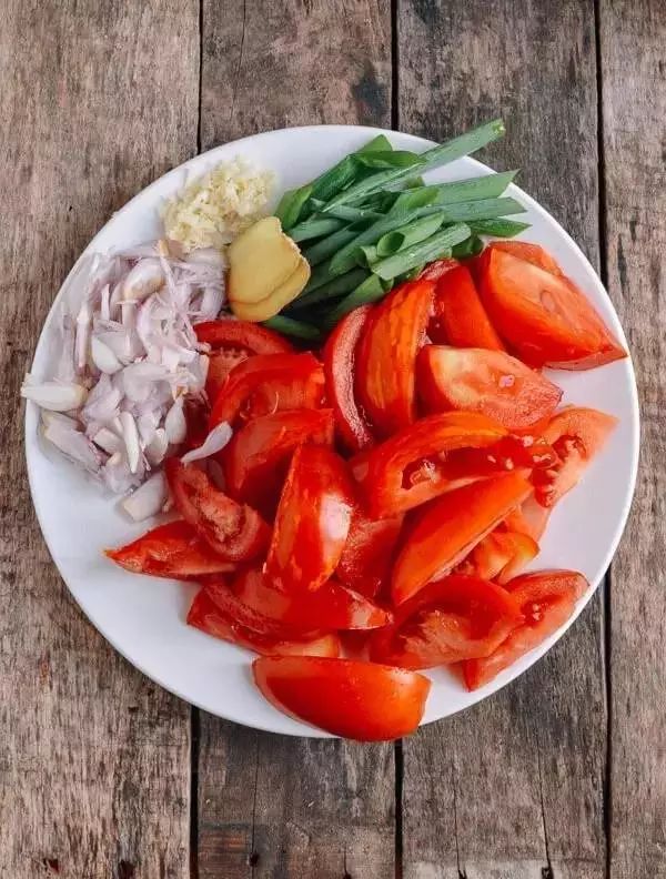 ▼倒入切好的番茄,将调好的酱汁倒入锅中翻炒,混合。