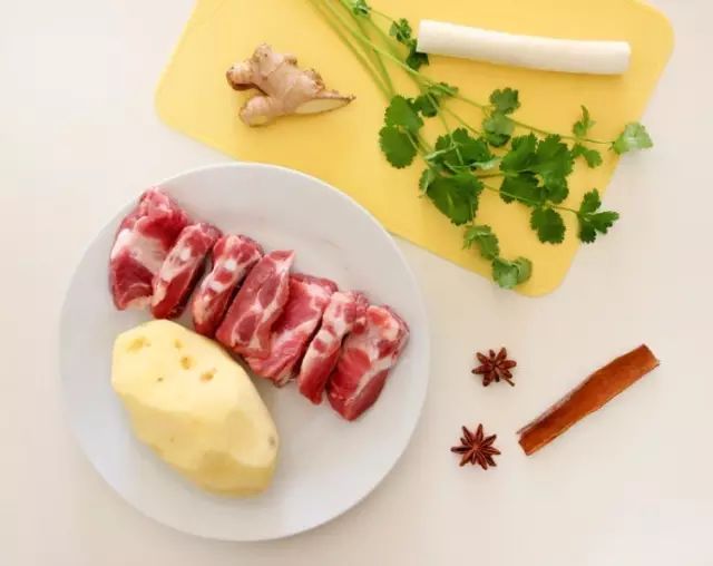 排骨斩成大小适宜的块,冷水入锅烧开,飞水去沫捞出沥干待用。土豆去皮用菜刀根部掰成不规则块状。