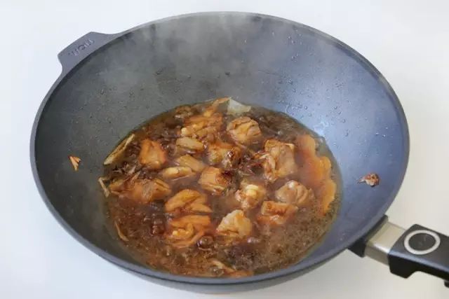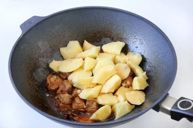 然后放入土豆块,翻炒均匀,靠余下的汤汁煨熟土豆,喜欢软烂可以适当延长时间,感觉锅要烧干就加开水。