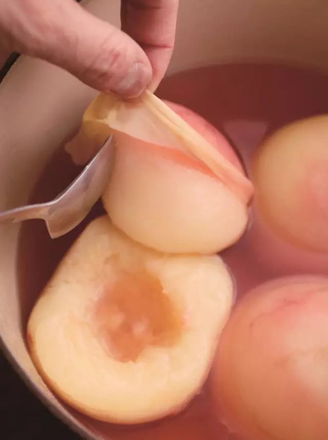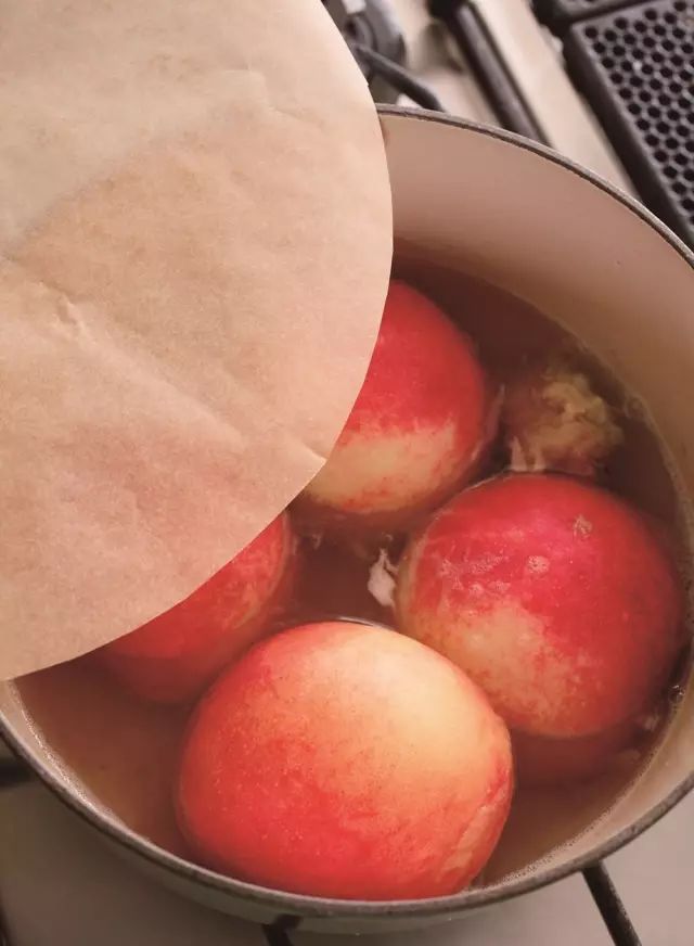 把锅从火上移开,揭开烤箱用纸的盖子,桃翻个儿,皮朝下,将果汁浇在上面,晾凉。
