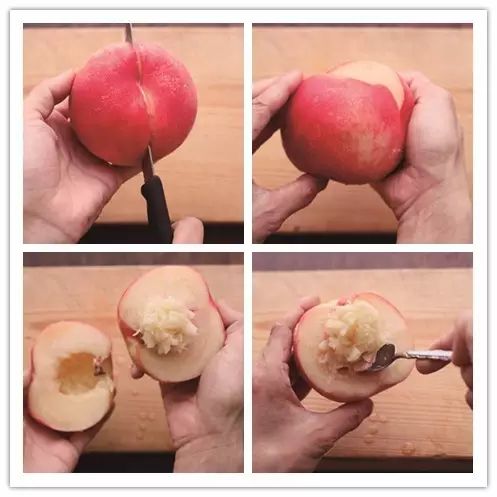 桃洗净后,沿桃缝入刀切。两手攥住桃的两边。掰成两半,用勺挖出桃核。桃核保留。