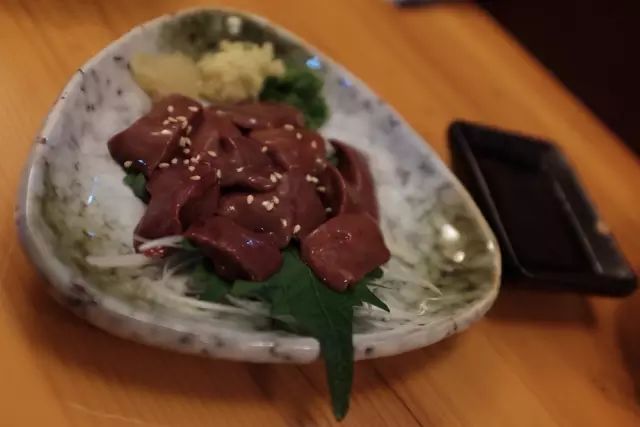 鸡肝刺身搭配麻油和盐的酱料,软嫩又微有韧性,裹上麻油更为滑顺,内脏独特的肝脂香味得到最大的突出。