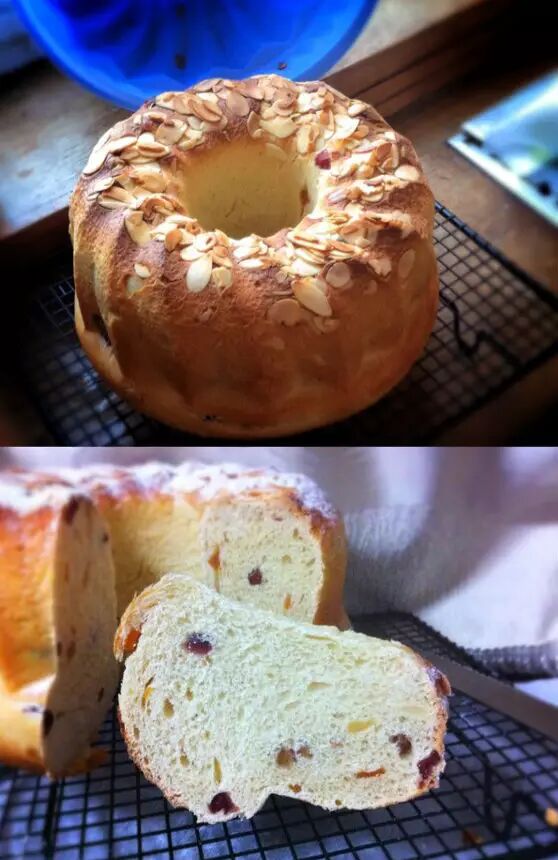 至于为啥不像Stollen那样裹着果料一起烤,梦厂揣测,是因为米兰那儿还有一款终极甜食大杀器——Panettone(潘妮朵尼)啊!这款罪恶的大家伙,是Pandoro和Stollen的remix版,既蓬松柔软似蛋糕,又塞满好料甜如蜜——它的可比Stollen甜多了,因为不只在面团里加果料,面团本身还含有不少糖。因为糖油量太高,面包发酵很困难,所以制作上必须采用天然酵母(类似我们的“老面”)+低温冷藏的方式,一般得耗费3天到一周的时间来完成,就跟我们提前熏腊肉赶制“年货”似的……而且由于水分少,这款面包特别便于储藏和携带,是很多国家的圣诞伴手礼首选。