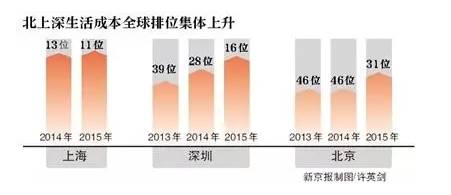 11日消息,据经济学人智库发布全球生活成本调查显示,中国国内城市在2015年生活成本集体上升,上海蝉联中国大陆“最昂贵”的城市,跟昔日“亚洲最贵城市”东京比肩,排名攀升至全球第11位。深圳跃升至全球第16位,北京排名全球第31位。(《新京报》)