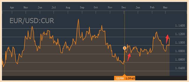 周四晚间欧元、欧股也经历了过山车,欧元兑美元急速下跌、欧股上涨,随即欧元兑美元上升、欧股下跌。分析普遍把这归结于欧洲央行行长德拉吉的讲话,他在讲话中暗示欧央行的降息进程将暂告一段落,未来关注点将从负利率转向其他非传统工具,比如QE(量化宽松)。