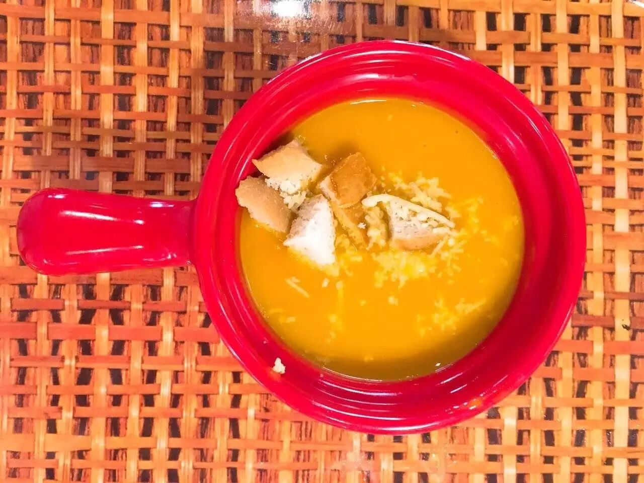 在咸口的南瓜汤里加了奶酪末和烤过的面包块,奶酪融化在南瓜汤里,汤汁的味道更浓郁、丝滑,面包块又吸收了南瓜汤香浓的味道,变得软软的。这三者的味道、质地和谐地融为一体时,真是一个大大的惊喜!(想要体验就自己去尝试哟~XDDD~~)