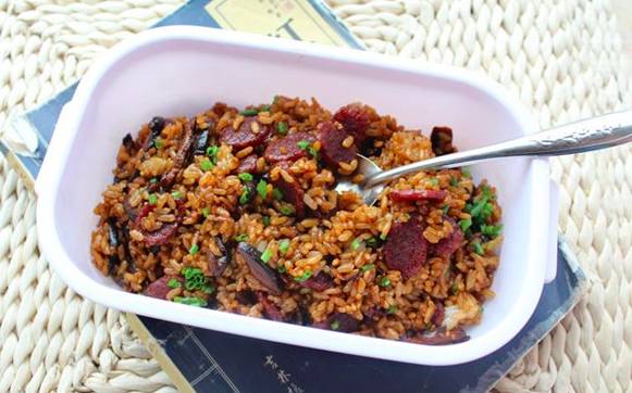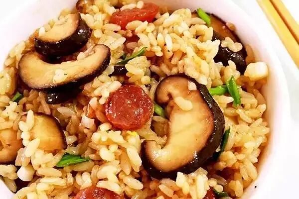 将炒好的原料倒入电饭锅,启动电饭锅,一锅香喷喷的香菇腊肉饭就要出锅啦