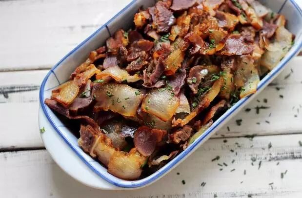 出锅后加青蒜调味。(爱吃辣椒者可加干红辣椒炝锅,味道更香。腊肉本身有咸味,老抽与盐适量。)