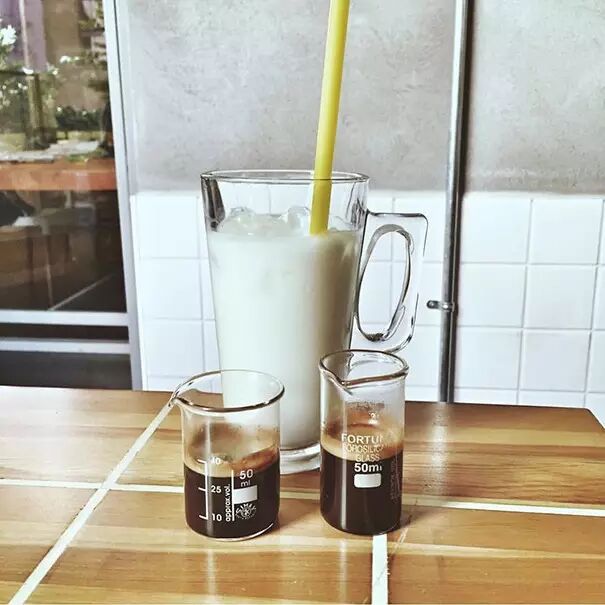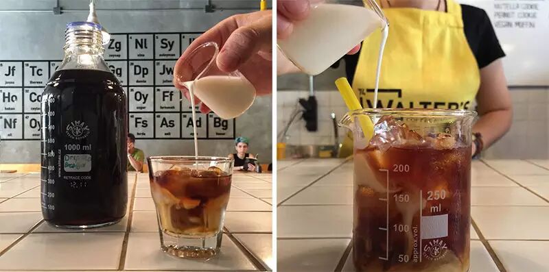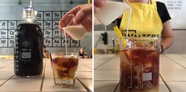 ▲ 咖啡和饮品被盛放在带有刻度的量杯、烧瓶中,而未经处理的咖啡豆则包装成好像会带来危险的产品。