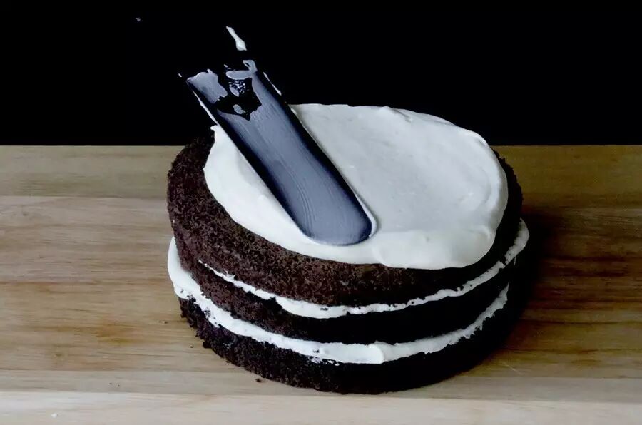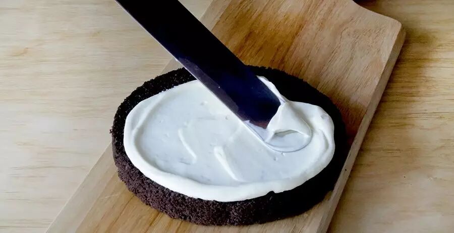 (2)200ml淡奶油加入10g糖粉,打发出浓稠的奶油霜,然后用抹刀随意地抹在最底层的蛋糕片上;