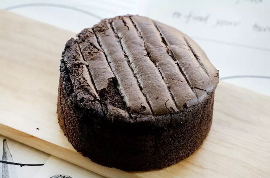 (8)蛋糕出炉后,迅速倒扣在烤架上,让底部湿气尽快散发出去,避免烤后塌陷,冷却之后方可脱模;