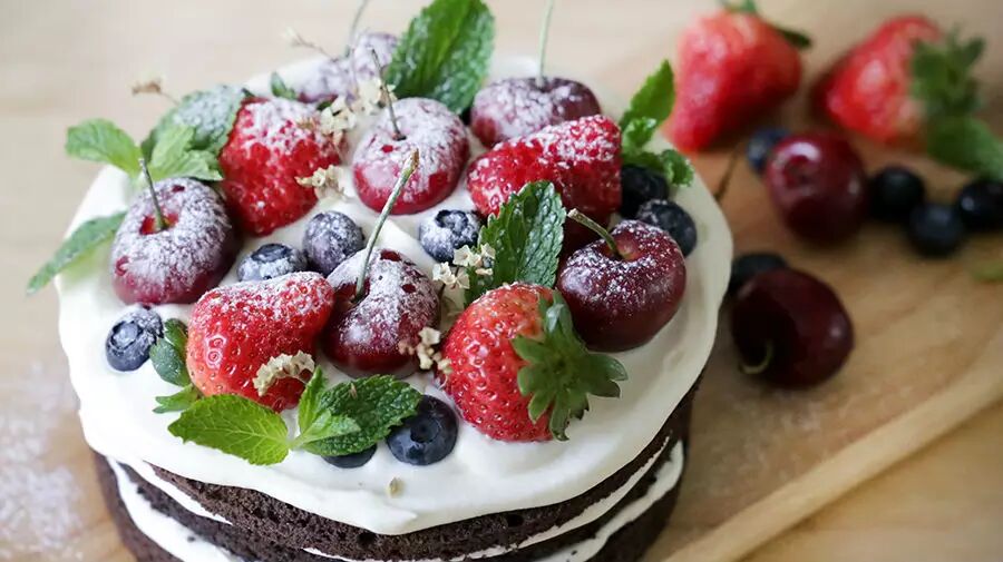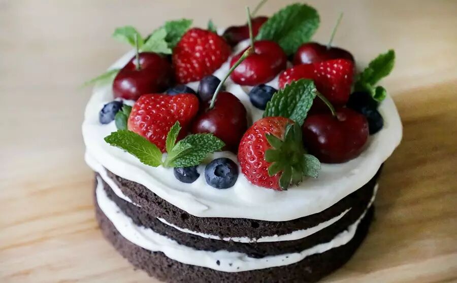 (4)将完整的草莓、樱桃、蓝莓错落有致地码在蛋糕顶层,先放大果子,再放小果子,最后插上几片薄荷叶子,还可以筛些糖粉,这样就完成啦~
