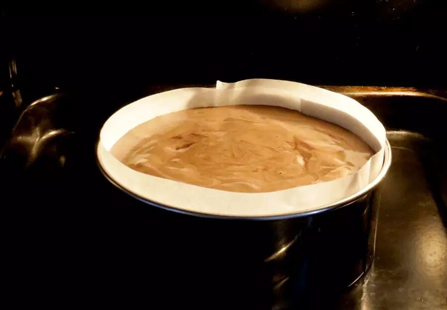 (6)将混合好的蛋糕糊倒入6寸圆模,用手握住模具侧壁,在桌上轻震几下,把内部的大泡震出,再用牙签插入面糊中画Z字,注意是画Z字而不是画圈!不然面粉容易上筋,影响蓬松度;