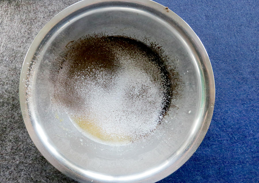 (2)将20g细砂糖一次性放入蛋黄碗中,用手动打蛋器搅拌均匀,然后倒入色拉油和牛奶,再次搅匀,放置一旁备用;