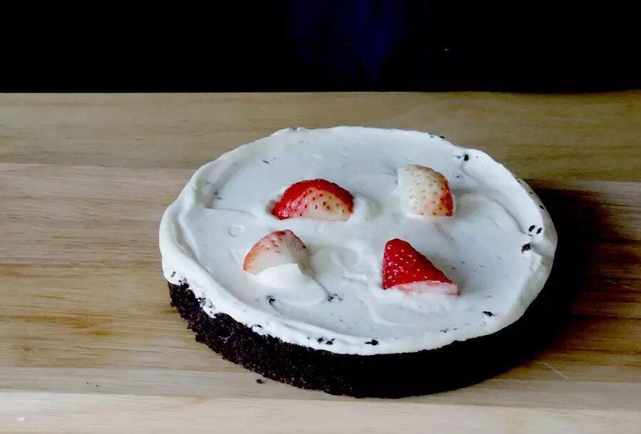 (3)在抹上奶油的蛋糕片上放切半的草莓,然后按一片蛋糕一层草莓奶油夹心的顺序,把3片蛋糕都叠起来;