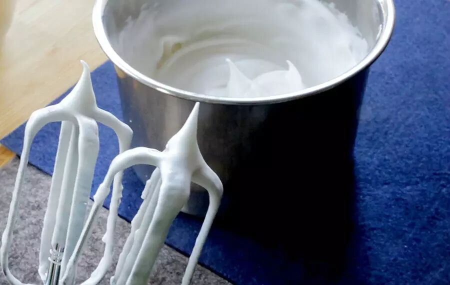 干性发泡状态,盆里和打蛋头上都是直立的尖角