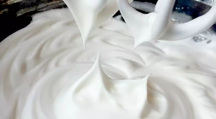 打出“鱼眼泡”后,第二次加糖,转快速搅打