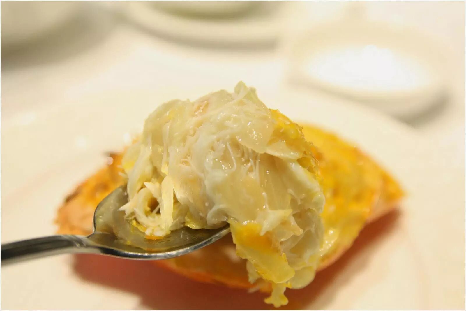 官燕焗酿蟹盖 金丝燕窝与足量蟹肉焗以蛋汁,柔滑清鲜