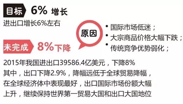 |点评| 预期增长,实际大幅下跌,说明去年年初对进出口形势预估有所不足。更确切地说,是对国际市场形势判断不足。去年全球市场低迷,大宗商品暴跌,中国自然难以独善其身。世贸组织近期公布,2015年71个主要经济体的进出口数据显示,出口整体下降11%,进口下降12.6%。中国出口下降2.9%,进口下降,表现相对算好的了。
