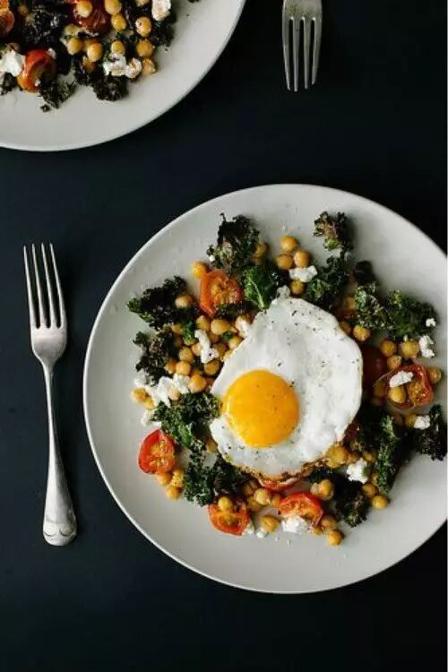 配料:荷包蛋、焯烫过的羽衣甘蓝/菠菜和圣女果、海盐、黑胡椒